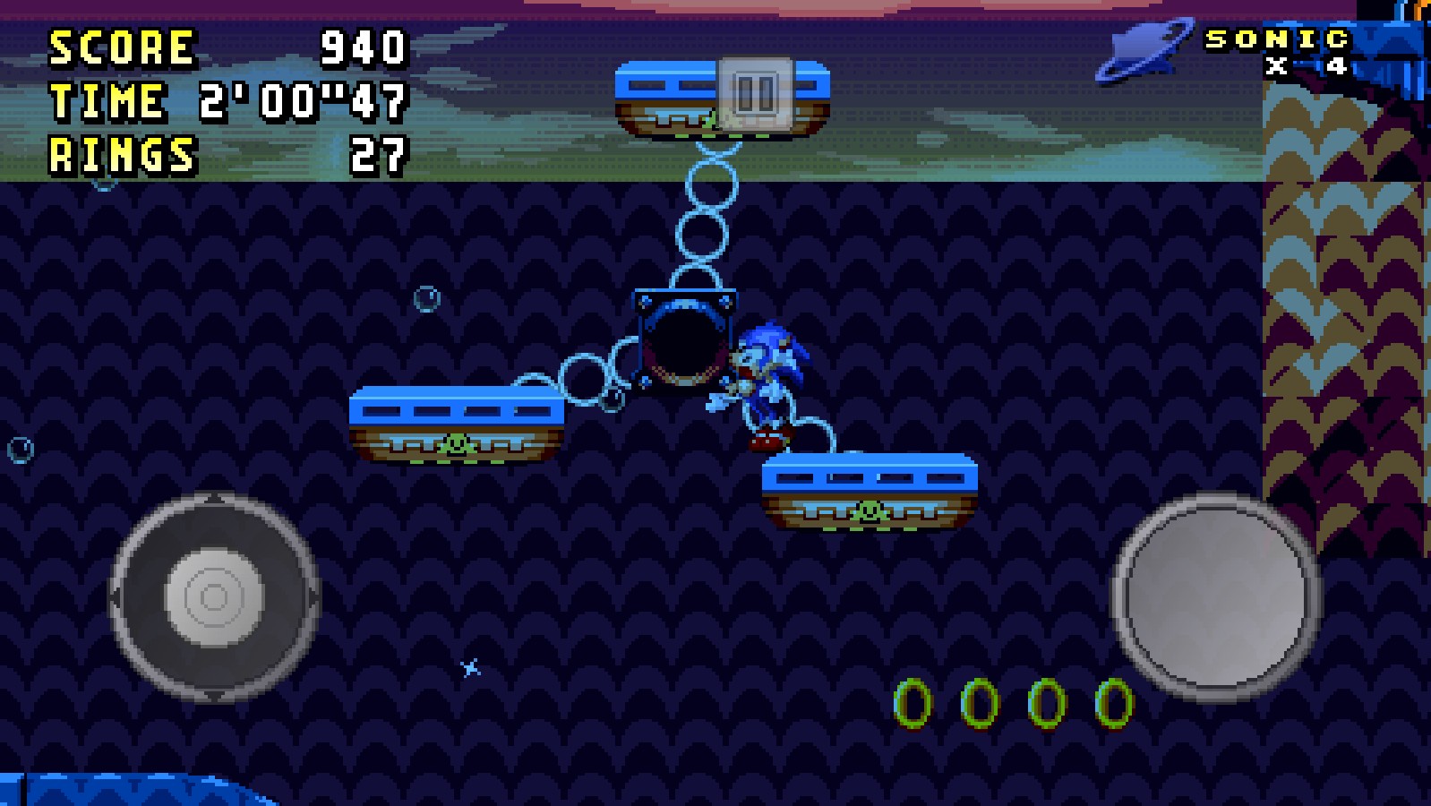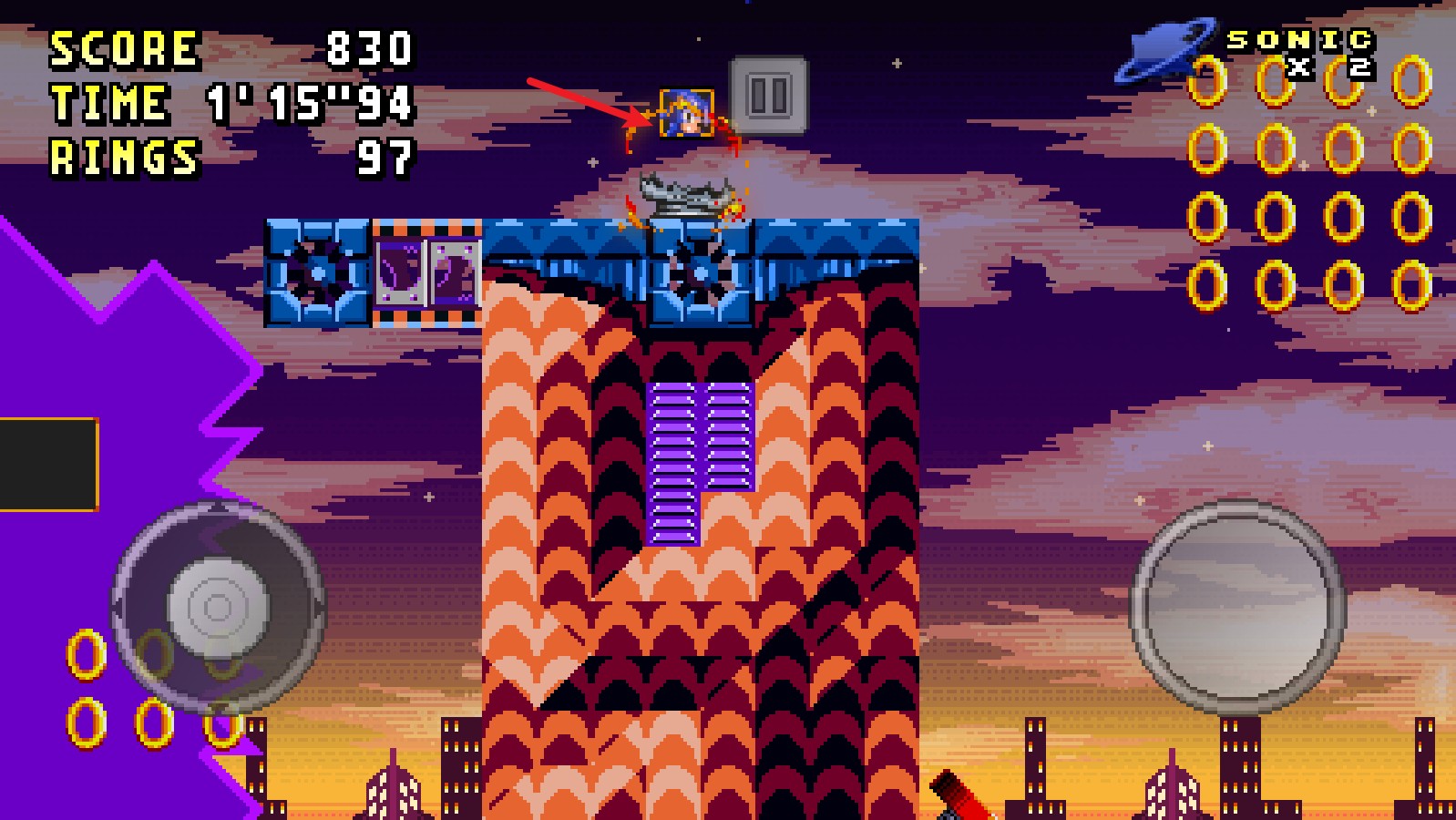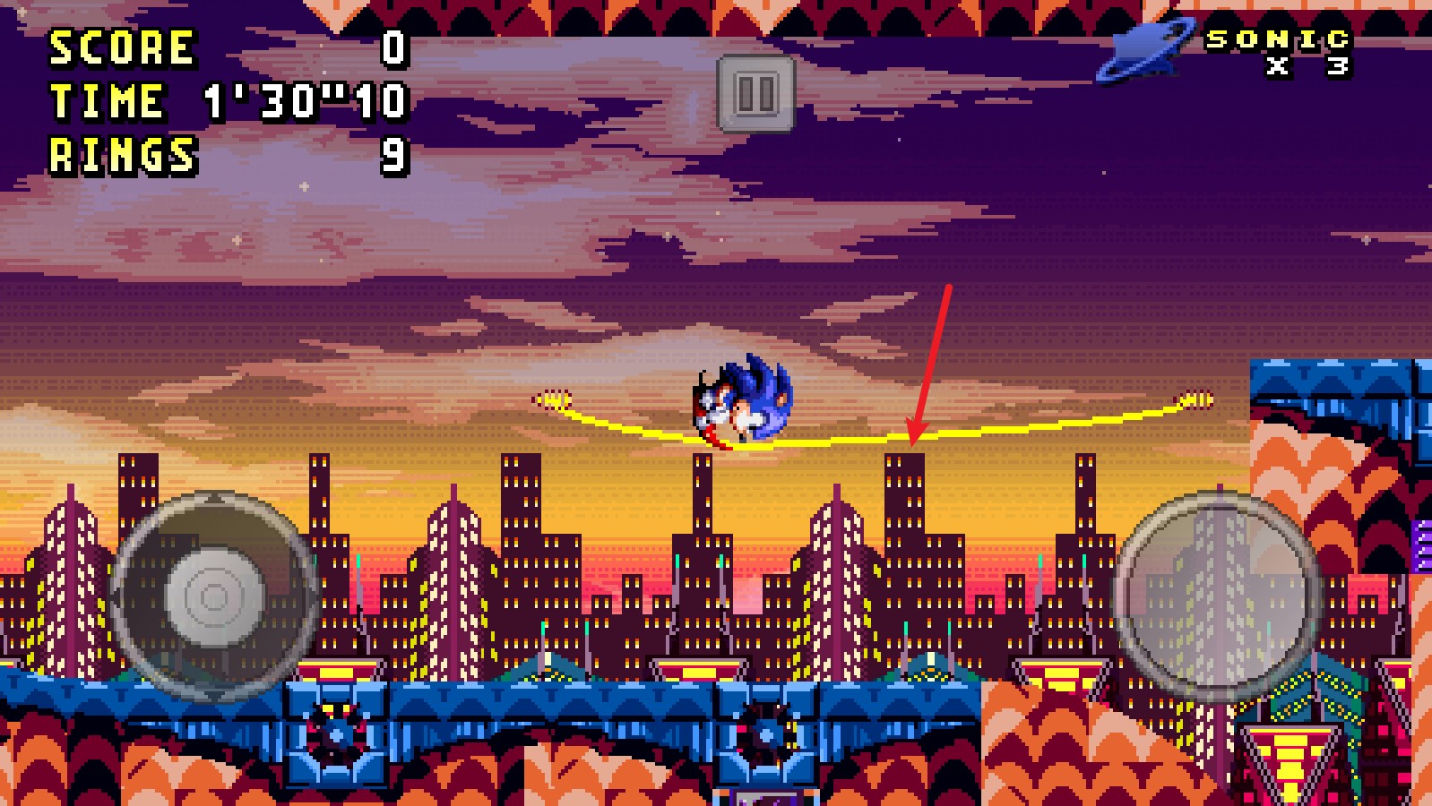 右側(cè)的按鈕能夠操控索尼克跳躍,而且長(zhǎng)按該按鈕的話,索尼克會(huì)跳得更高一些。