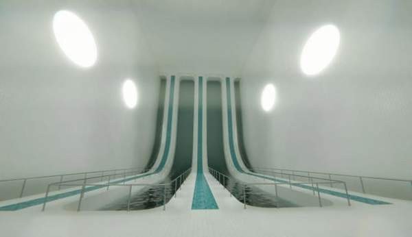 位于三角形區域有橙色滑梯的大房間外的走廊。