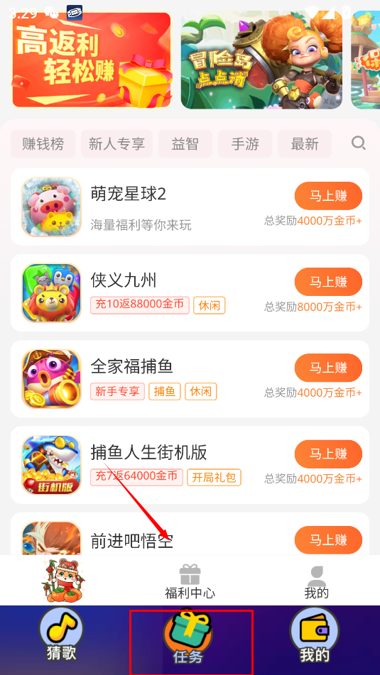 首先在游戲界面點擊下方的“任務”按鈕切換頁面,接著選擇福利中心。