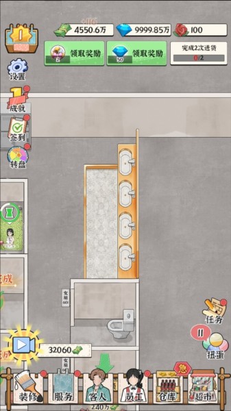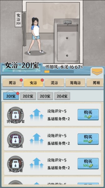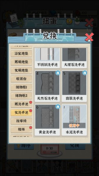 進入游戲后,點擊下方第一個按鈕就能升級浴場,還能解鎖各類裝飾物品。