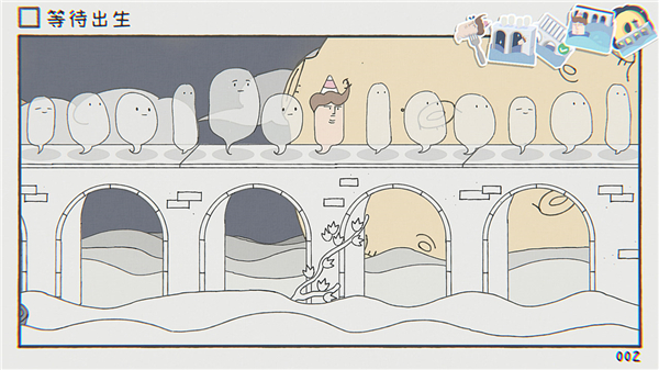 游戲以“等待”作為貫穿始終的線索,將阿蛋從降生到長大成人的數十個生活片段串聯起來。玩家不必遵循固定的目標,可以通過和場景互動、觸發彩蛋或者靜靜看著時間流逝來推動劇情發展。比如,在雨中等待的時候,玩家可以選擇用小狗的葉子或者河童的葉子當作傘,也可以躲在屋檐下打發時間;在公交站插隊或許會被推到水里,卻能意外觸發隱藏的成就。游戲借助荒誕的互動設計,把原本平凡的等待變成了充滿驚喜的冒險。