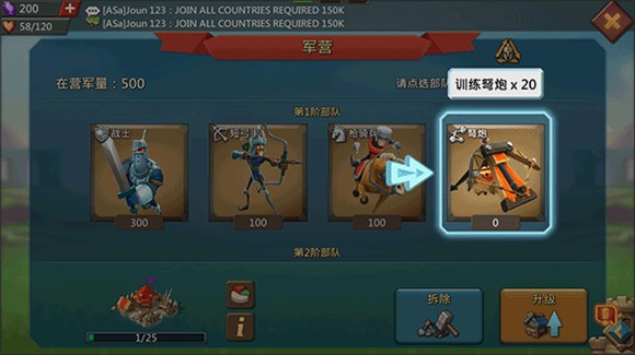 小R的核心任務是搭建防御工事,推薦的英雄也是為了適配防御體系。兵種方面優先造步兵和弓兵,騎兵盡量少出——畢竟推薦英雄的加成主要針對步兵和弓兵。三者的比例可以參考3:1:6、4:0:6或3:0:7,采集兵建議造T1車,具體數量根據自身情況調整即可。