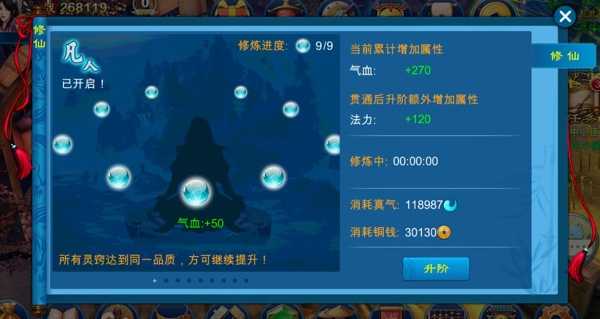 每條修仙線路都得修煉到圓滿狀態才能升階,升級過程中會消耗真氣與銅幣,不過紫色和橙色品質的升階,還得額外消耗指定道具【千年神水】。