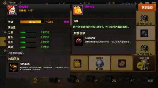小伙伴們給寵物升級時,還能使用其他高等級寵物,寵物的等級和品質越高,提供的經驗就越多,因此玩家們沒有經驗寶。