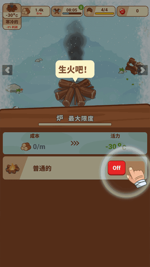 要是想直接開始游戲,點擊屏幕的任意一處就能跳過對話內容,進入主界面后,首先要做的就是點燃柴火堆。