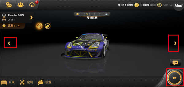 比賽開始前,你可以先點擊左右兩側的欄目來切換賽車,選好自己喜歡的賽車后,再點擊右下角的標志就能啟動比賽了。