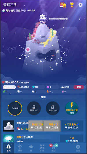 首先在【石頭】標簽頁里,我們能通過點擊石頭讓原本孤零零的珊瑚石逐步成長;隨著【珊瑚石】等級提升,每次點擊帶來的生命產(chǎn)出量會相應增加。石頭每升級25級,就能解鎖一次點擊生命產(chǎn)量翻倍的獎勵。因此升級石頭時,務必以25級為一個階段來操作——畢竟單次升級石頭帶來的點擊產(chǎn)量提升實在不起眼,真正關鍵的收益還是來自每25級解鎖的產(chǎn)量翻倍獎勵。