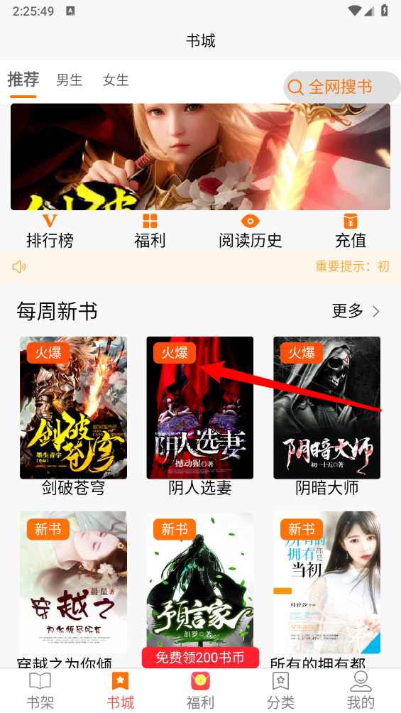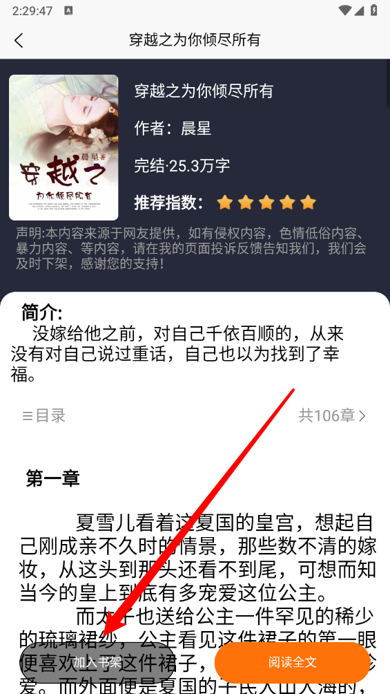 然后進(jìn)入小說詳情頁,點(diǎn)擊"加入書架"。