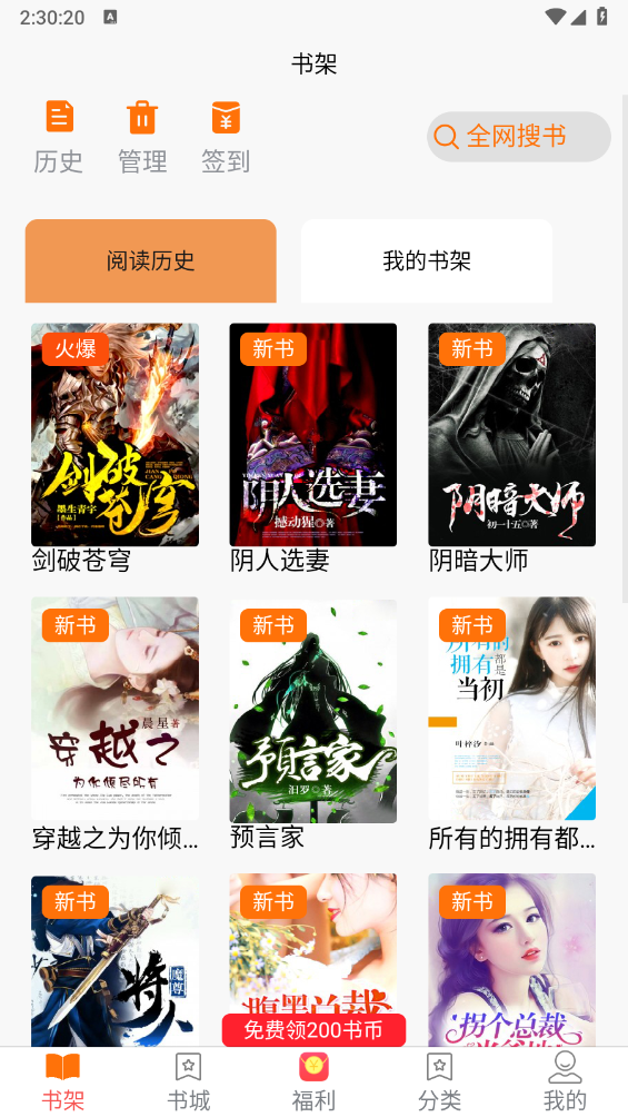 支持書架管理與小說分類管理功能,用戶能夠通過多屏滑動(dòng)便捷地瀏覽書架內(nèi)的書籍,并且支持對(duì)書架中的書籍進(jìn)行搜索。