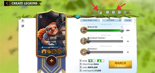 屏幕左下角的主要圓形按鈕,除了用于進出城市外,還包含4個隱藏功能。這些功能可幫助您直接跳轉到世界地圖的特定縮放級別:按住該按鈕一秒鐘,會彈出4個選項。從上至下,前兩個選項能直接跳轉到世界地圖的最高縮放級別;之后,您可通過左側選項僅查看特定元素,如道路、聯盟資源、標記等。總體而言,這是一項實用功能,能讓您更清晰地查看地圖上的資源點、敵人、盟友及其他元素。 4. 創建軍團預設 軍團預設(Legion Presets)能為您節省大量時間——您可以預先組建多支配置不同部隊與指揮官組合的軍隊,并保存下來供日后使用。例如,您可創建一支配備強力PvP指揮官(可選擇帶或不帶副手)及最適配該場景的高等級單位的軍團;也可組建一支專門用于采集的軍團,搭配擁有采集天賦的英雄與運輸單位。