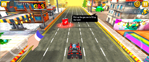 3、點擊左右按鈕移動收集“油桶”來增加油量,當左上角的油量清零時,一局游戲結束;
