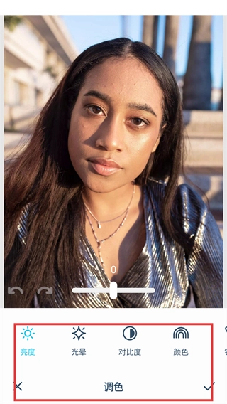 切換到【調色】功能界面,便能對【亮度】【光暈】等參數進行調整,拖動滑塊即可實時查看調色后的效果。