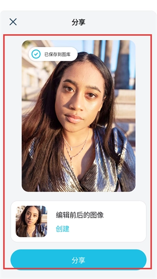 編輯操作完成后進入分享頁面,會看到圖片已成功保存至圖庫的提示,此時點擊【分享】按鈕,就能將編輯好的圖片發送出去了。