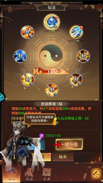 在打怪的路上可別忽略了自我提升呀!后面的怪物只會越來越厲害,點擊仙法就能一鍵升級啦。