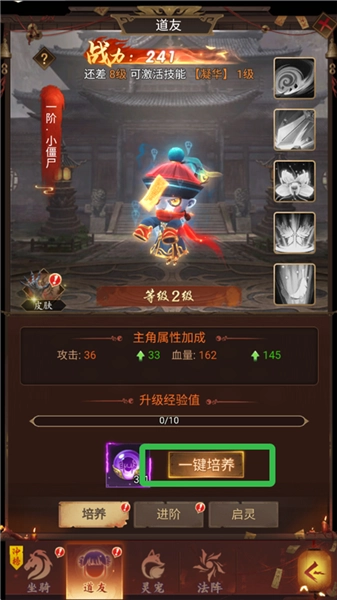 使用道友培養(yǎng)丹能夠增加培養(yǎng)經(jīng)驗,當(dāng)經(jīng)驗值累積滿時,培養(yǎng)等級會自動提升,每次升級都能為主角和道友帶來顯著的屬性加成。