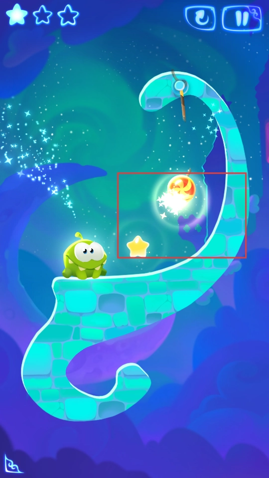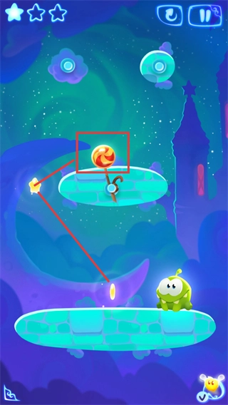 調(diào)整割斷繩子的先后順序,使【糖果】移動(dòng)至右側(cè)平臺(tái)周邊,保證綠色角色可以順利觸碰到糖果,從而達(dá)成當(dāng)前階段的目標(biāo)。