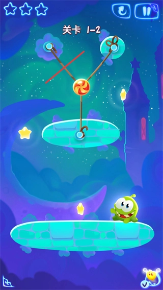 在【關(guān)卡1-2】里,第一步要切斷相連的繩子,讓【糖果】順著軌跡落下,這樣綠色角色就能吃到它,從而推動(dòng)游戲繼續(xù)進(jìn)行。