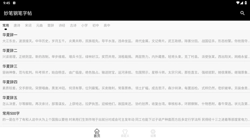 《妙筆鋼筆字帖》是長沙春覺信息科技有限公司匠心打造的字帖軟件,致力于幫助用戶練出漂亮的鋼筆字。不管你偏愛何種風格,它都能適配你的審美需求。軟件內不僅收錄了豐富多樣的字帖資源,還支持根據個人偏好靈活調整字體的大小、顏色等參數,讓每一次練習都能帶來舒適且自主的體驗。你既可以直接在手機端進行書法練習,也能一鍵打印自定義的字帖內容,輕松實現紙質書寫與數字練習的無縫轉換。