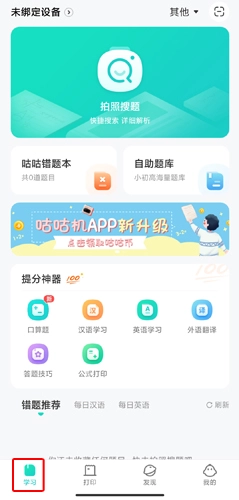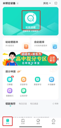 學(xué)習(xí)頁面具備豐富多樣的功能,除了拍照搜題、咕咕錯(cuò)題本和自助題庫外,還涵蓋了其他科目的提分工具。