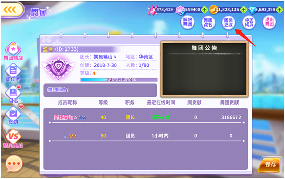 更新之后,舞團團長能夠在舞團管理頁面找到并點擊【團徽更改】按鈕,從而為自己的舞團設置一個風格契合的專屬團徽。現(xiàn)階段系統(tǒng)共提供4種不同的團徽圖樣供團長挑選。