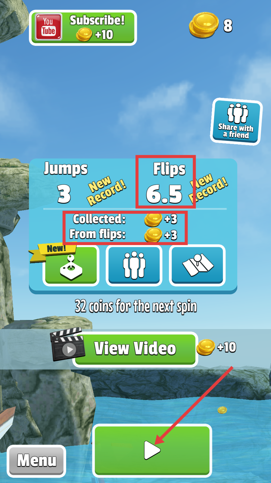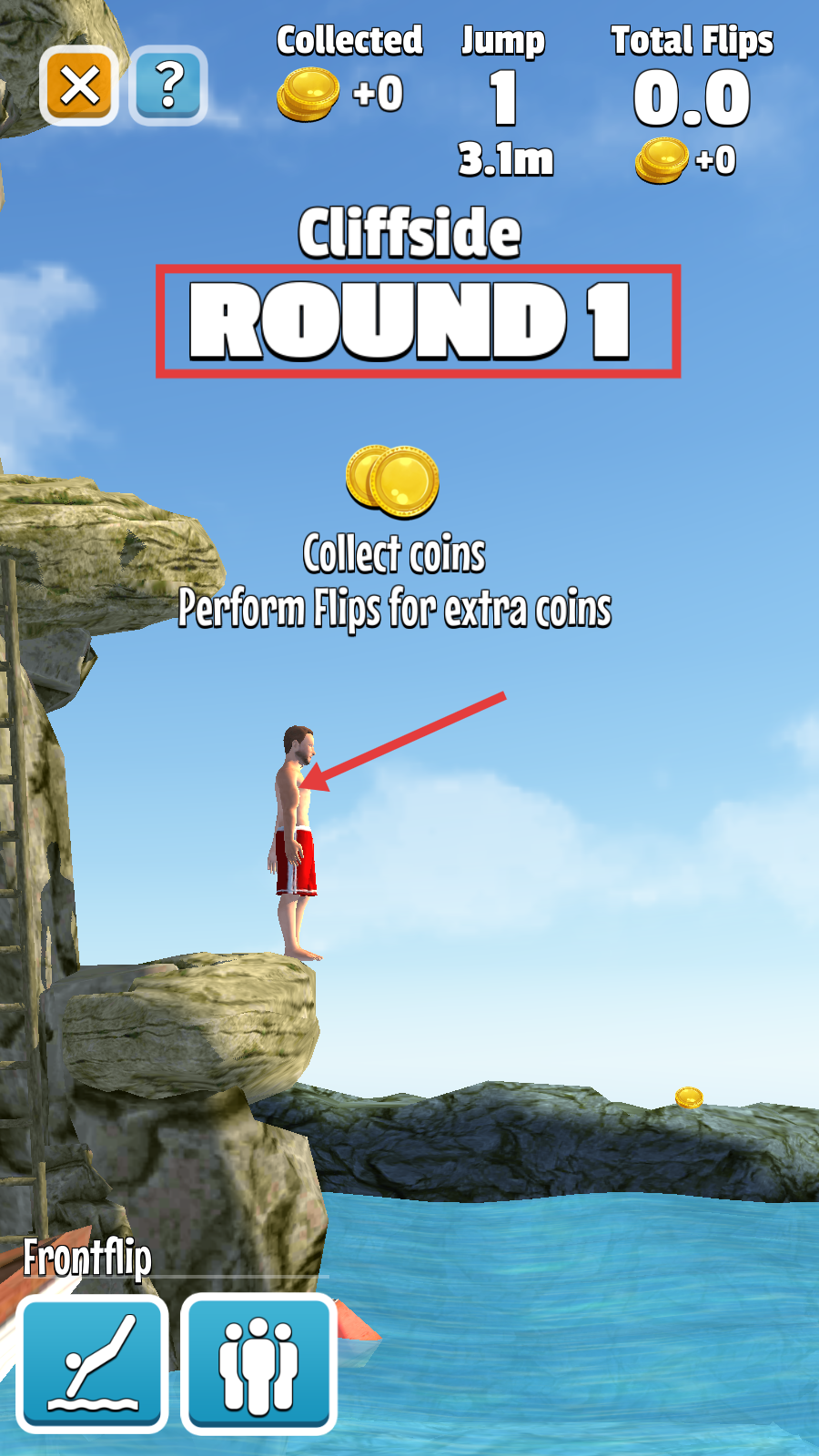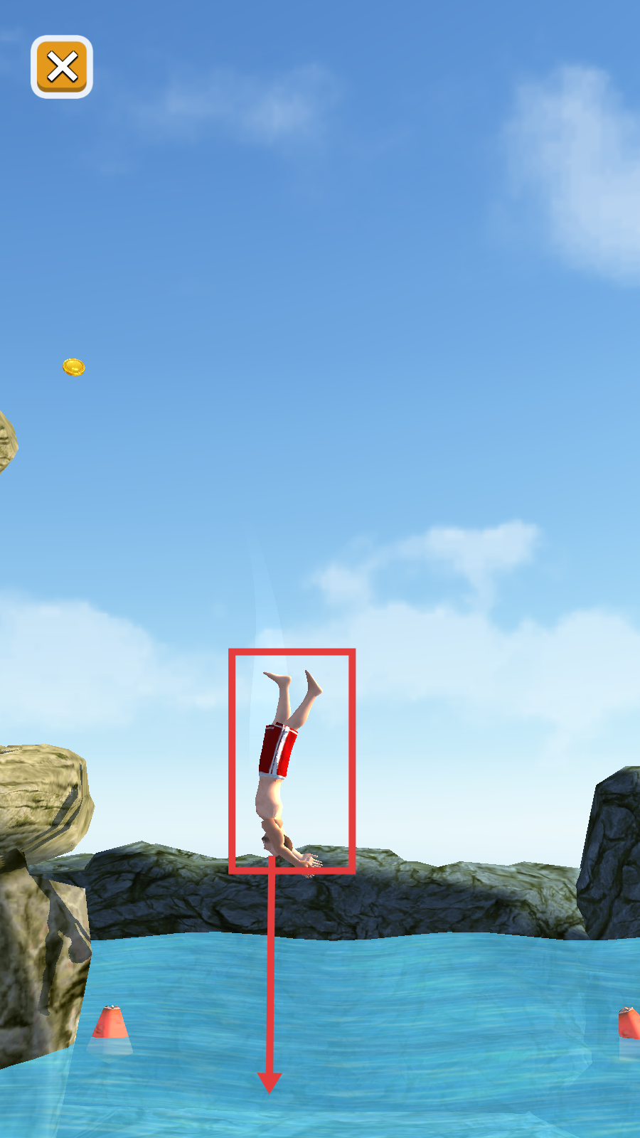 控制角色做出翻轉動作,準確跳入水中,通過提高翻轉的質量來贏得更多的金幣和分數。