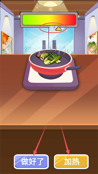 長按右下角的加熱按鈕來調節火候,留意屏幕上方的“完美”指針,盡可能讓指針停留在完美區域,這樣就能得到最佳效果,操作完成后點擊“做好了”提交菜品。