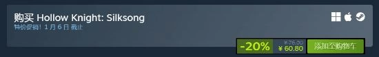 空洞騎士絲之歌首次迎來發售折扣,現價60.8元